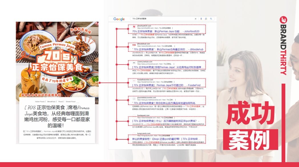 很多人误以为排名就等于结果,但实际上,“被看见”只是第一步,能不能建立信任感才是核心。像马来西亚柔佛的新兴品牌顾问机构 Brandthirty,就主打“品牌全球曝光SEO”,他们不仅让品牌上首页,更确保出现在用户眼前的是新闻报道、专题访问、用户评论、品牌官网等高度可信的内容矩阵。